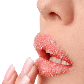 Apply a small amount of sugar scrub to the lips and massage in to gently exfoliate the lips.